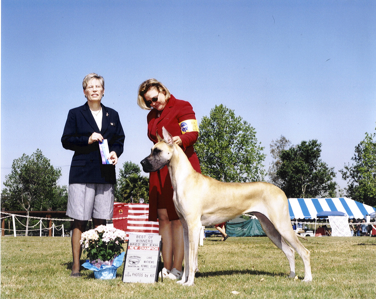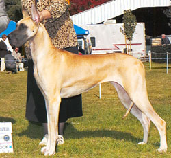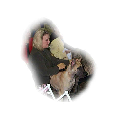 She was futurity nominated along with her sister Zen for the 2002 GDCA National Specialty. Shown in the 3 - 5 mos class she made the first cut under breeder judge, Kathy Varian.
